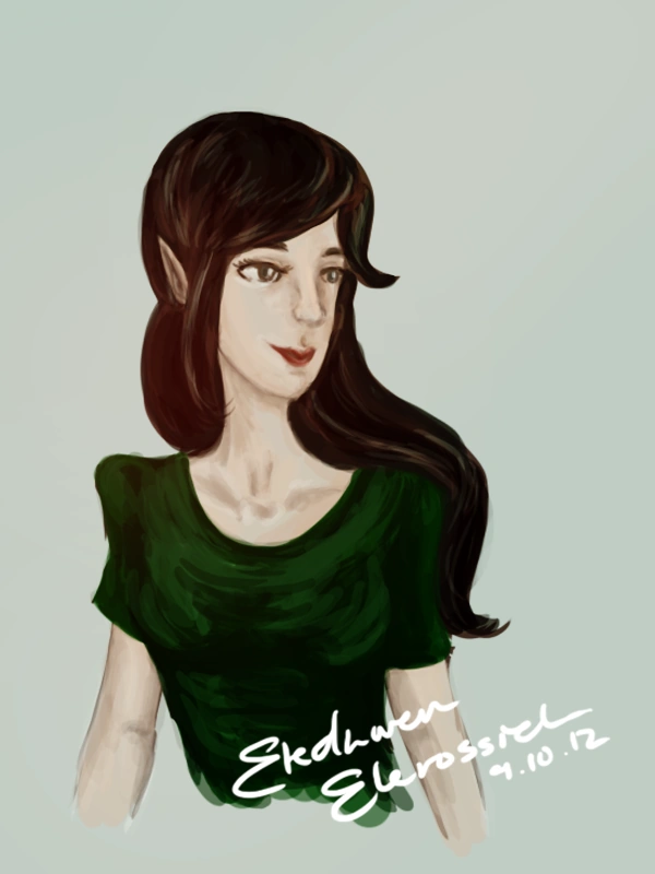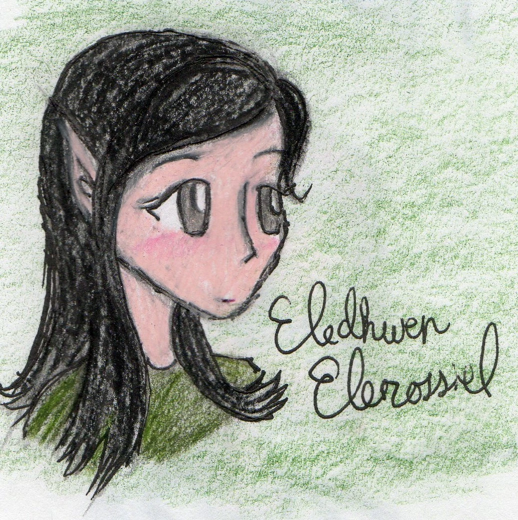 Eledhwen has a wide knowledge of things a typical elleth shouldn't know, partly because she attended OFUM after joining the Canon Protection Initiative (those fangirls are good teachers in the ways of modern conversation), and partly because of her partner's fandom-collecting habits. She can hold her own with modern slang, although she sometimes confuses terminology and is wont to slip back into archaic speaking patterns if a Suefic gives her a migraine. She will also lapse into Sindarin, too, and apparently has taught Christianne a plethora of Elvish swears. Indeed, Eledhwen is proud of her heritage and will maintain mannerisms and idioms from Middle-earth, and enjoys working back home because she gets to set thing straight (although her status as Canon extra means that Canon characters can see her, even if they don't recognise her). She has recently revealed that "Eledhwen Elerossiel" is an alias, but insists people use the name anyway, since she's grown unnaturally fond of it.