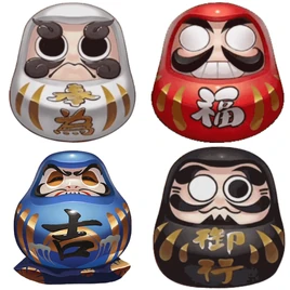 Daruma dolls are a fortune item in Japanese culture, modeled and named after the monk Bodhidharma. New dolls have pupilless eyes; one would draw a pupil in one eye as one makes a wish to the doll, and once the wish comes true, the other eye will be filled.